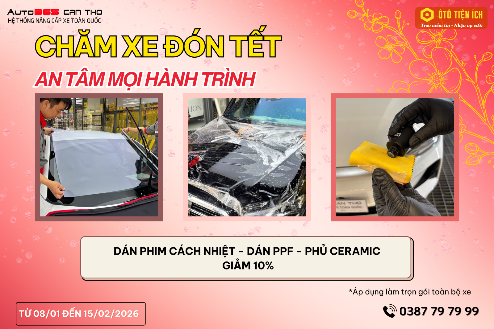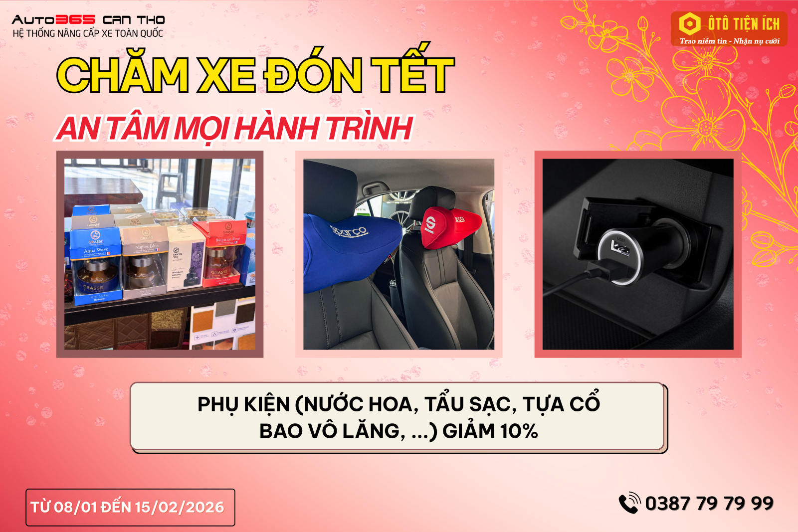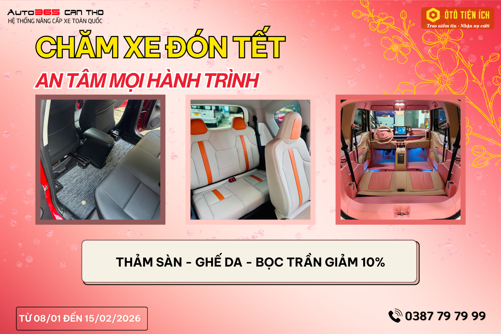 Không chỉ chú trọng vận hành, việc nâng cấp không gian nội thất cũng góp phần mang lại cảm giác thoải mái và an tâm trong suốt hành trình Tết. Các hạng mục như thảm sàn, ghế da và bọc trần giúp xe sạch sẽ hơn, êm ái hơn và tăng tính thẩm mỹ rõ rệt. Dịp này, Auto365 triển khai ưu đãi hấp dẫn giúp khách hàng dễ dàng làm mới nội thất xe với chi phí tiết kiệm, sẵn sàng cho những chuyến đi dài ngày cùng gia đình.