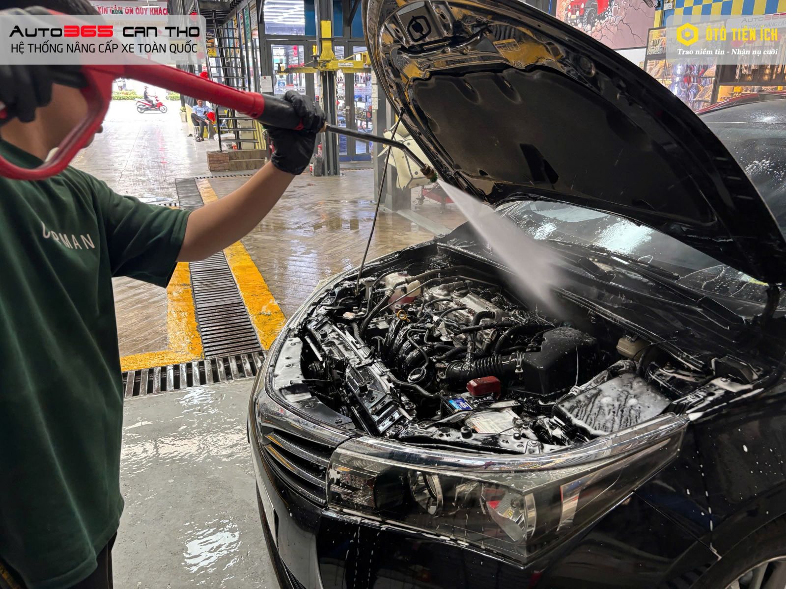 KTV sẽ bịt lỗ thông gió để ngăn nước vào bên trong hệ thống lọc gió. Sau đó sử dụng bàn chải mềm và các dụng cụ chuyên dụng để vệ sinh khoang máy, xịt toàn bộ khoang máy với nước sạch, không xịt trực tiếp nước vào bề mặt động cơ.